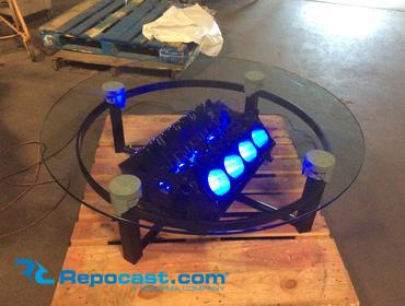 The block coffee table is available in two different heights, both with rectangular top. The mounted pistons are leveled/welded to ensure the glass tabletop sits flat. We sell a standard engine block coffee table, plus quote custom projects.